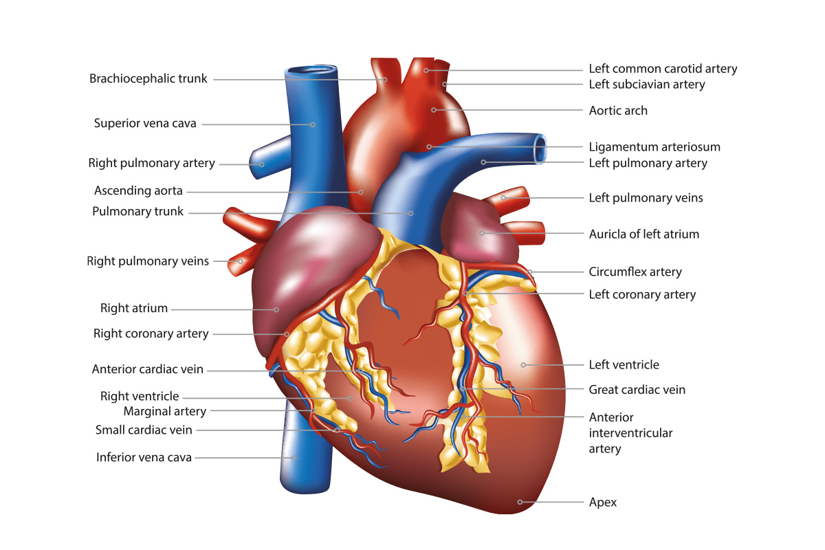 Kalbin ön taraftan görünümü; sol ventrikül (karıncık), sağ ventrikül (sağ karıncık) ve sağatriumun (sağ kulakçık) ön kısımları çıkarıldıktan sonra
